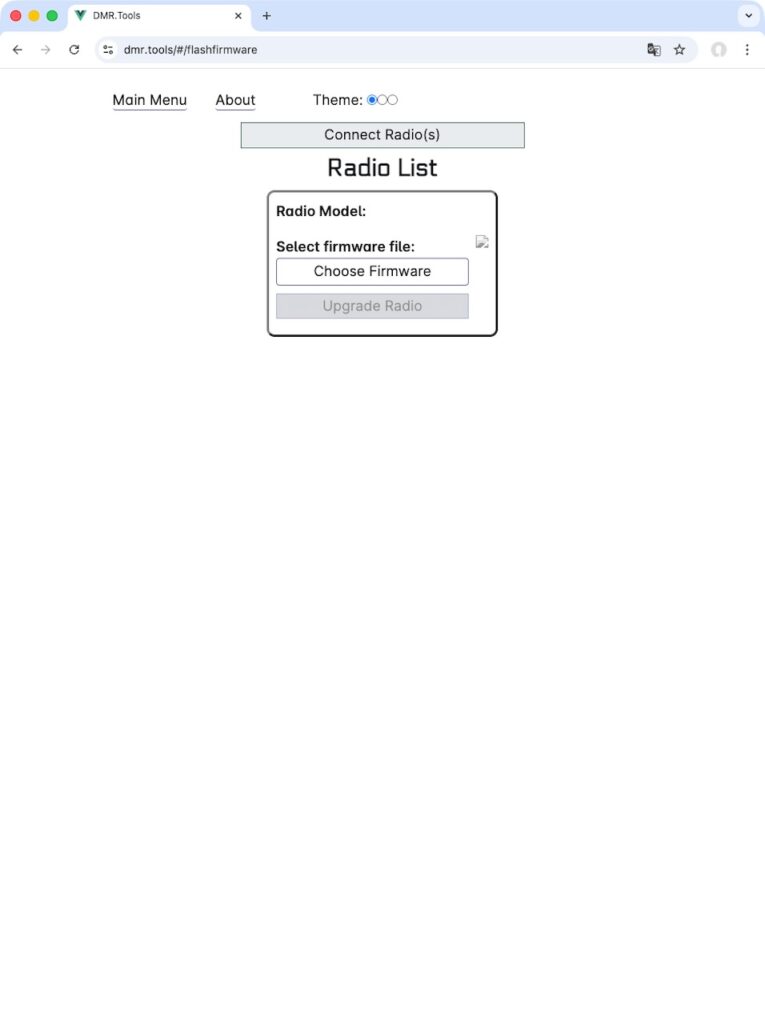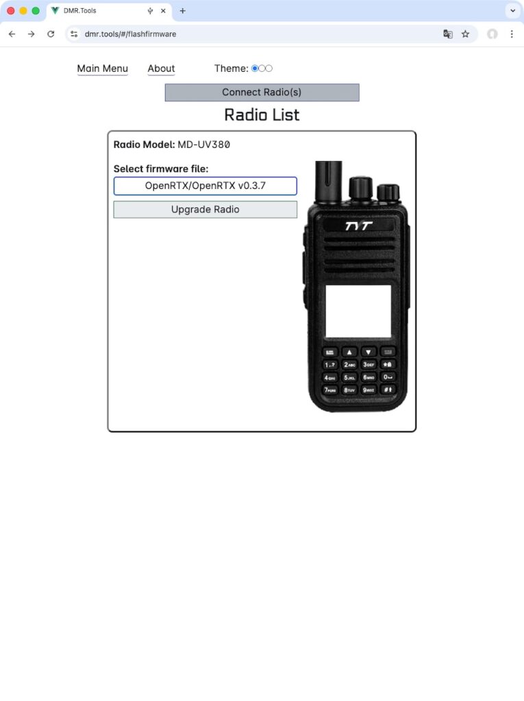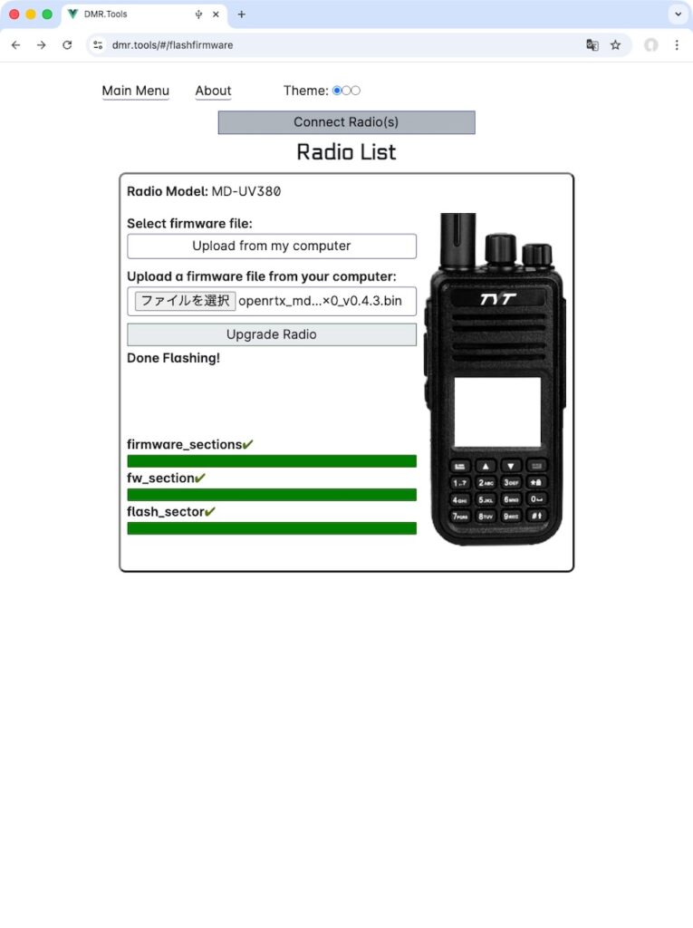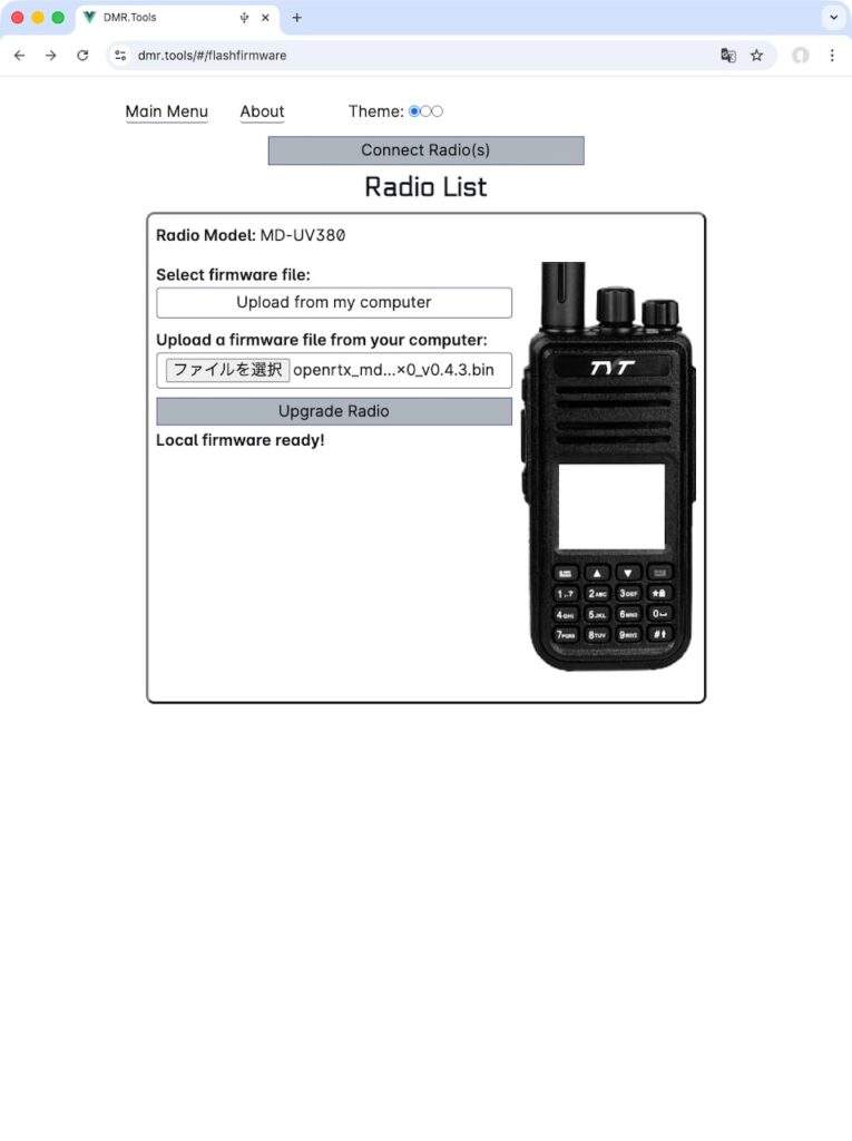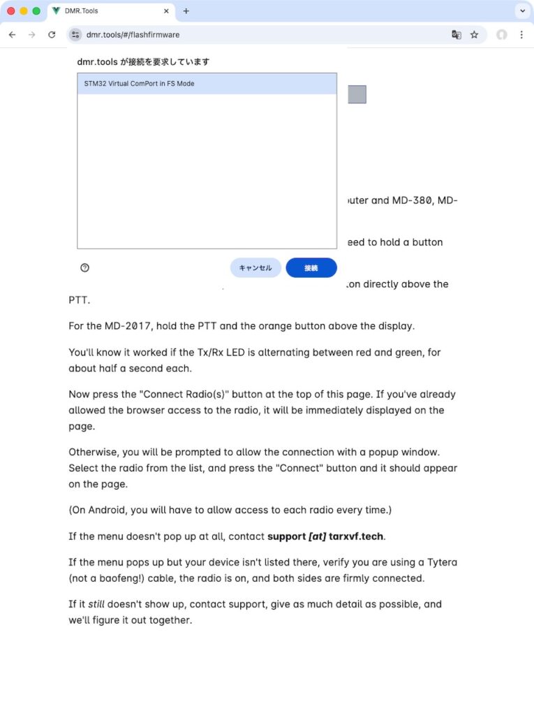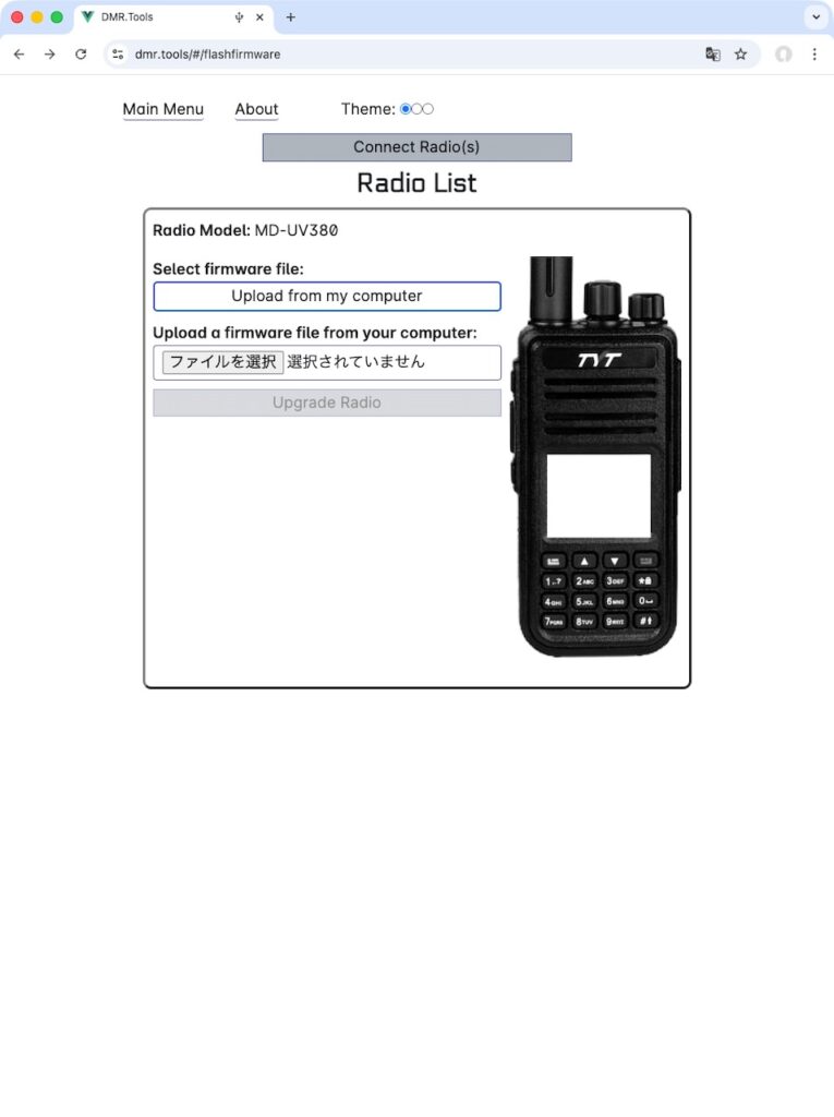 なんとWebブラウザでDMR.toolsのサイトに行き、無線機とUSBで接続した状態にすると、ソフトウェアの書き変えができます